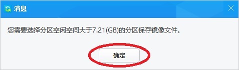 4、软件提示“您需要选择分区空闲空间大于XXX(GB)的分区保存镜像文件”,点下面确定按钮。