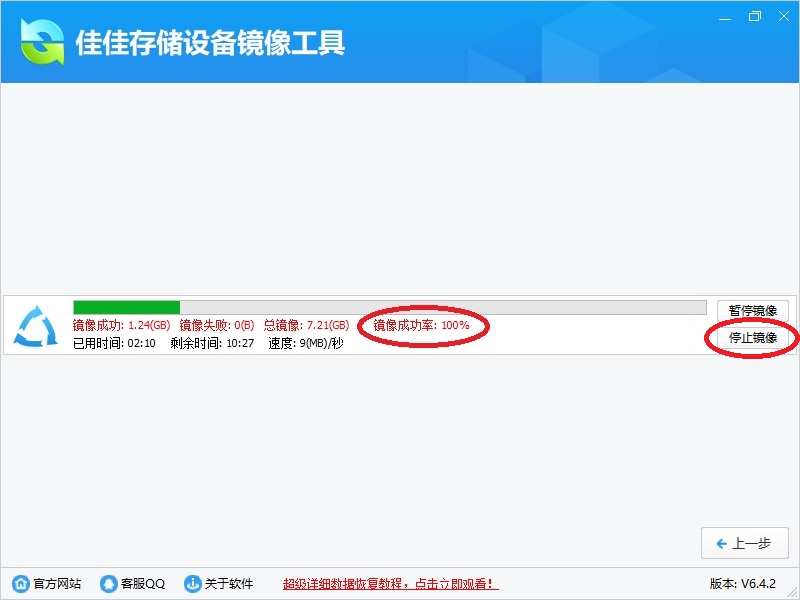 8、有的存储设备,可能前面一部分镜像成功率很高,后面成功率很低。您可以点右边的[停止镜像]按钮,停止镜像,然后按下面步骤分析已经镜像的数据。
