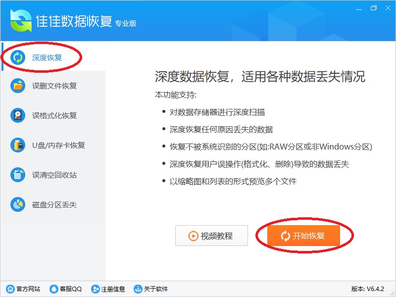 10、运行佳佳数据恢复软件,使用[深度恢复]功能,点[开始恢复]按钮。